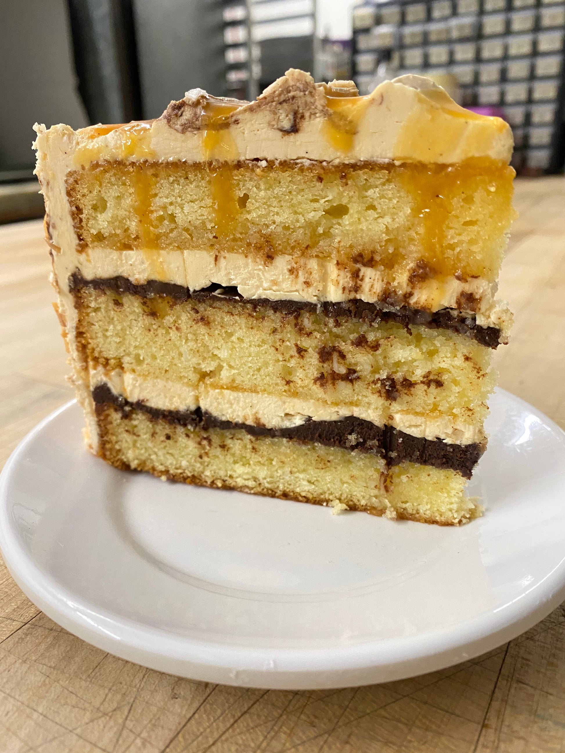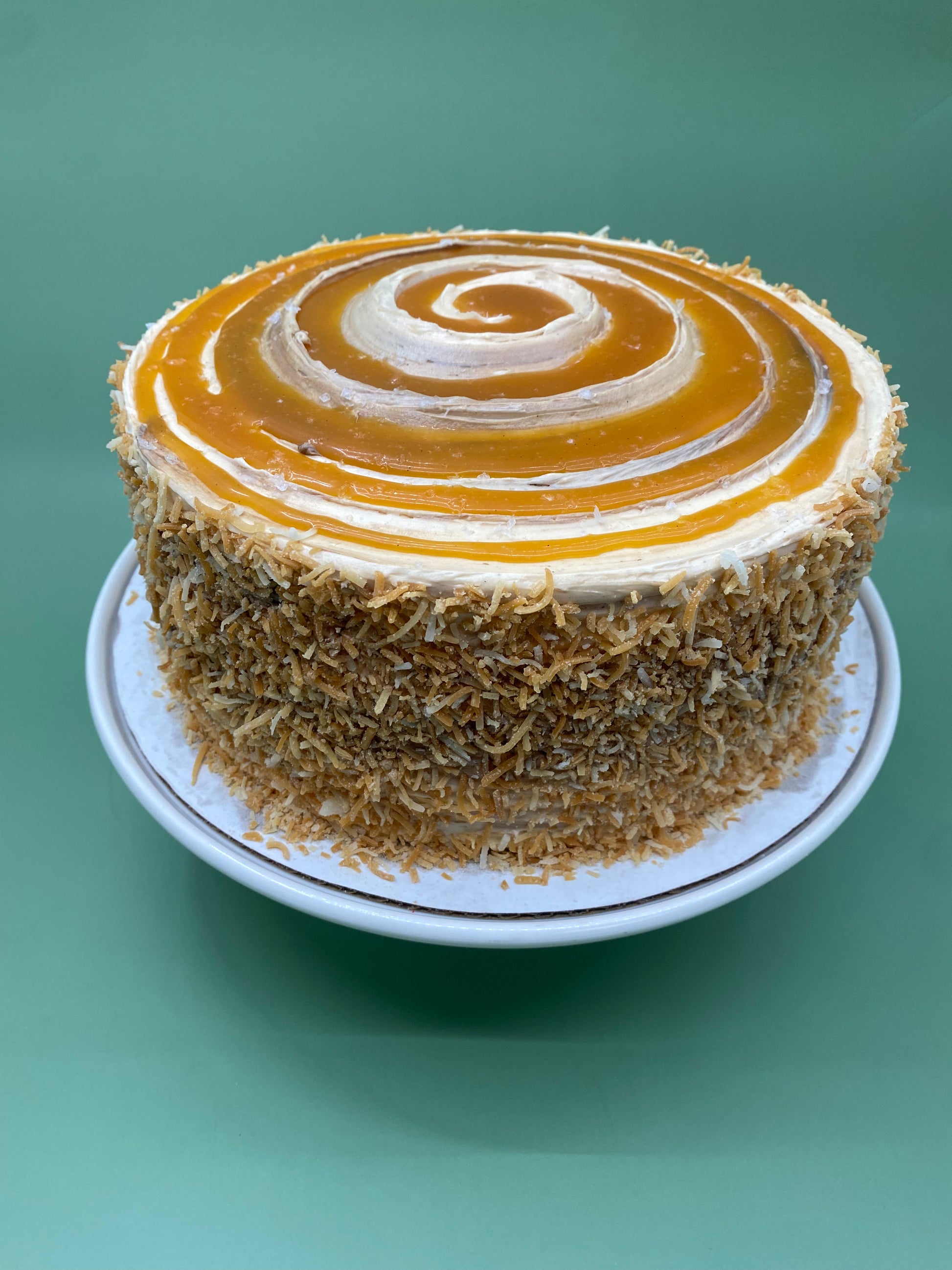 Inspired by the classic cookie, this indulgent cake layers rich coconut cake with silky dark chocolate ganache and luscious salted caramel buttercream. Finished with a dreamy caramel drizzle, every bite is a perfect balance of sweet, salty, and decadently tropical.